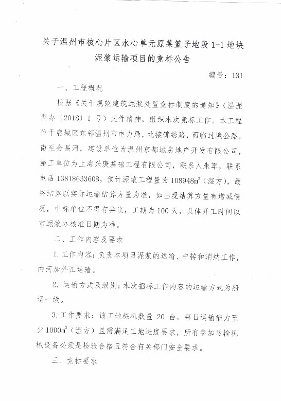 关于温州市焦点片区水心单位原菜篮子地段1-1地块泥浆运输的竞标通告