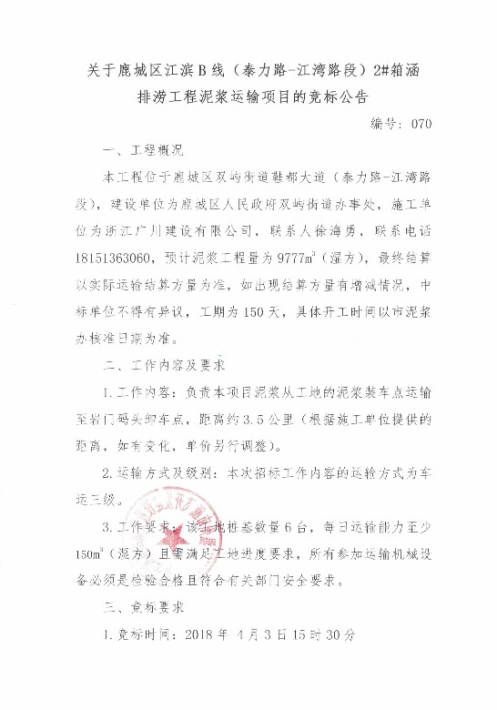 ¹ØÓÚ¹³ÇÇø½±õBÏߣ¨Ì©Á¦Â·-½Í巶Σ©2#ÏäºÅÅÀÔ¹¤³ÌÄཬÔËÊäÏîÄ¿µÄ¾º±êͨ¸æ