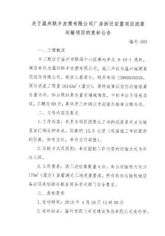 ¹ØÓÚÎÂÖÝÁª·áƤËÜÓÐÏÞ¹«Ë¾³§·¿²ðǨ°²¶ÙÏîÄ¿ÄཬÔËÊäÏîÄ¿µÄ¾º±êͨ¸æ