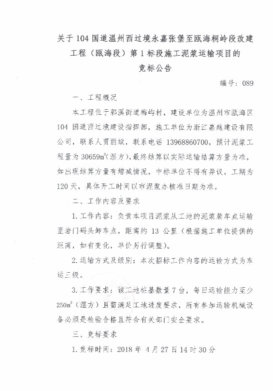 ¹ØÓÚ104¹úµÀÎÂÖÝÎ÷¹ý¾³ÓÀ¼ÎÕű¤ÖÁ걺£Í©Áë¶Î¸Ä½¨¹¤³Ì£¨ê±º£¶Î£©µÚ1±ê¶ÎÊ©¹¤ÄཬÔËÊäÏîÄ¿µÄ¾º±êͨ¸æ