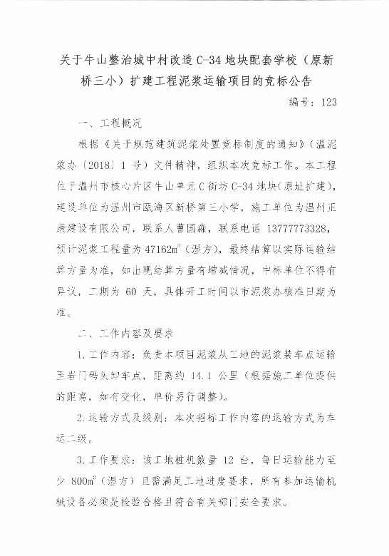 ¹ØÓÚţɽÕûÖγÇÖдå¸ïÐÂC-34µØ¿éÅäÌ×ѧУ£¨ÔÐÂÇÅÈýС£©À©½¨¹¤³ÌÄཬÔËÊäÏîÄ¿µÄ¾º±êͨ¸æ