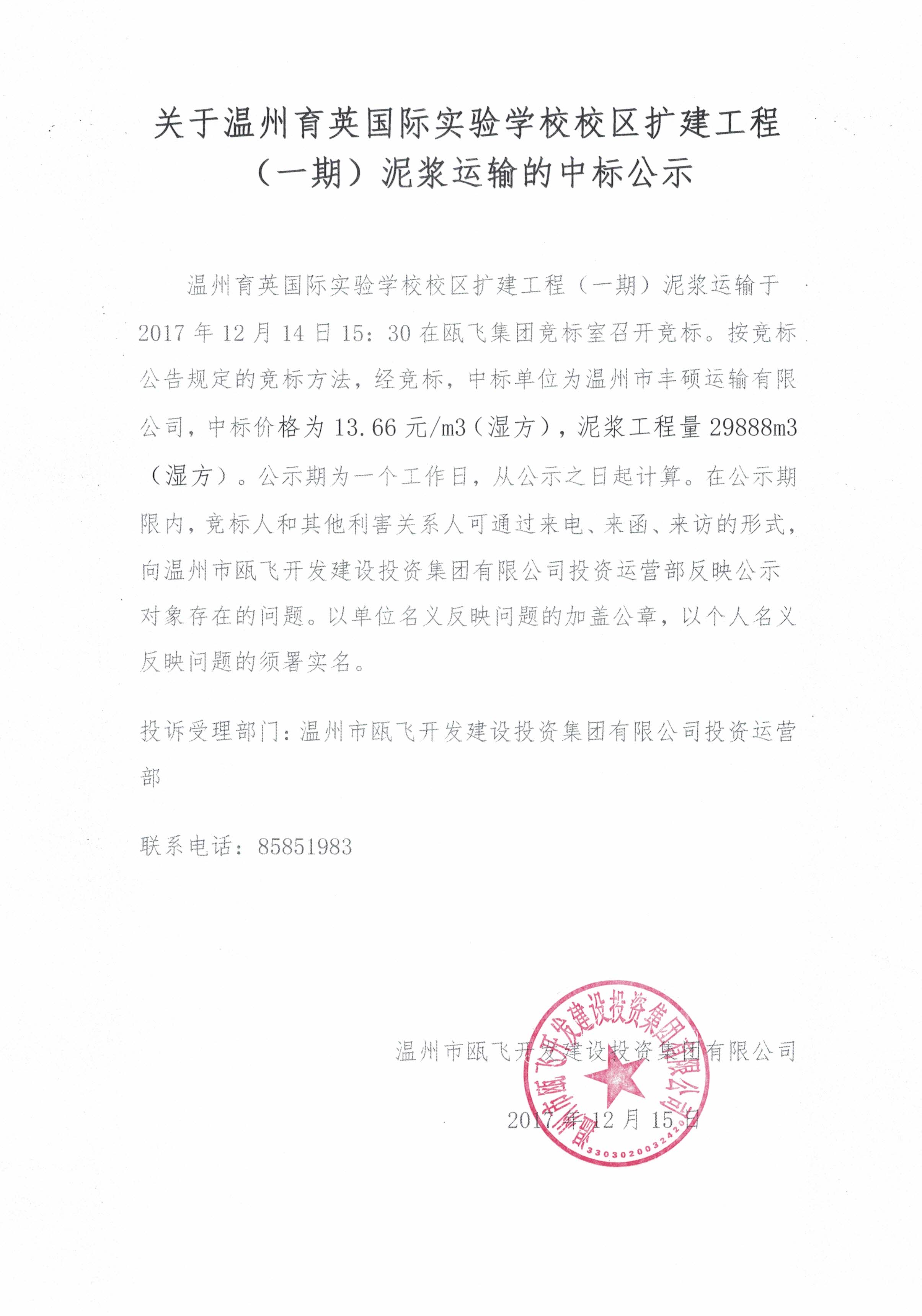 ÎÂÖÝÓýÓ¢¹ú¼ÊʵÑéÑ§Ð£Ð£ÇøÀ©½¨¹¤³Ì£¨Ò»ÆÚ£©ÄཬÔËÊäÓÚ2017Äê12ÔÂ14ÈÕ15£º30ÔÚBG´óÓμ¯Ížº±êÊÒÕÙ¿ª¾º±ê¡£°´¾º±êͨ¸æ»®¶¨µÄ¾º±êÒªÁì £¬¾­¾º±ê £¬Öб굥λΪÎÂÖÝÊзḻÔËÊäÓÐÏÞ¹«Ë¾ £¬Öбê¼Û¸ñΪ13.66Ôª/m3£¨Êª·½£© £¬Äཬ¹¤³ÌÁ¿29888m3£¨Êª·½£©¡£¹«Ê¾ÆÚΪһ¸öÊÂÇéÈÕ £¬´Ó¹«Ê¾Ö®ÈÕÆðÅÌËã¡£ÔÚ¹«Ê¾ÆÚÏÞÄÚ £¬¾º±êÈËºÍÆäËûÀûº¦¹ØÏµÈË¿Éͨ¹ýÀ´µç¡¢À´º¯¡¢À´·ÃµÄÐÎʽ £¬ÏòBG´óÓÎͶ×ÊÔËÓª²¿·´Ó¦¹«Ê¾¹¤¾ß±£´æµÄÎÊÌâ¡£ÒÔµ¥Î»ÃûÒå·´Ó¦ÎÊÌâµÄ¼Ó¸Ç¹«Õ £¬ÒÔ¸öÈËÃûÒå·´Ó¦ÎÊÌâµÄÐëÊðʵÃû¡£